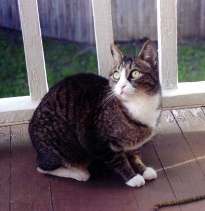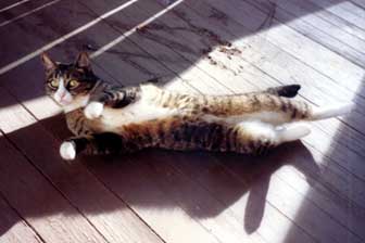 In August 2001, I buy Snufkin a “CatSpa” because the cat on the box looks like her. The model is shown grooming herself on the green brushes, giving herself a massage on the white bumpy areas, and cleaning her teeth and gums by chewing on the little ball in the middle.